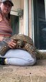 Woman is removing twine from her rescue tortoise after he got himself tangled in it!