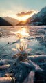 An ice lily blooming on a frozen lake, glowing in the sunset.
