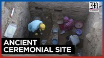 Archaeologists work at the excavation site of a newly discovered pre-Hispanic burial chamber in Peru's northern department of Cajamarca. The site, where human remains and several items used as offerings were found, was devoted to the cult of ancestors, according to experts.