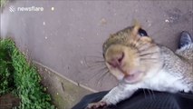 Curious squirrel climbs up photographer's leg to check out camera