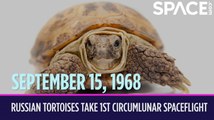 On Sept. 15, 1968, the Soviet Union launched the Zond 5 spacecraft on a mission to loop around the moon and return to Earth. <br /><br />There were no cosmonauts aboard Zond 5, but there were several smaller vertebrates — including the first two tortoises to ever go to space! Other passengers included wine flies, mealworms, plants and seeds. These were the first animals in deep space and the first to travel around the moon. After looping around the moon, the Zond 5 spacecraft turned around and came back to Earth. It was supposed to land in Kazakhstan on Sept. 22, but the spacecraft's guidance system failed, and it splashed down in the Indian Ocean instead. The Soviets did recover the capsule and found that the tortoises and other critters were still alive, although they had lost some weight since the start of the mission.