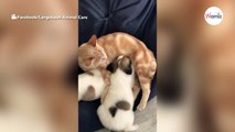 Esta gata da de mamar y lava a unos cachorritos de perro como si fueran suyos