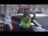 Seorang Polantas didorong WNA di Pos Polisi Simpang Sunset Road, Imam Bonjol, Denpasar, Senin(19/9). Petugas menghentikan pemotor yang merupakan WNA karena berboncengan tidak mengenakan helm.