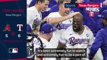 Texas Rangers' Marcus Semien and coach Bruce Bochy talk after taking a 3-1 lead over the Arizona Diamondbacks.