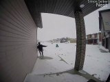 This woman was heading out to work when she slipped and fell on ice. It was raining the previous night and the cold temperatures turned the water into ice over the driveway. Luckily, she was okay and laughed off the incident while her husband helped her up.