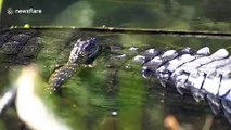 Brave tiny alligator rests on mum's back before going for a solo swim