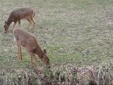 A large herd of Sika Deer ran across an open field and into the woods.