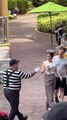 Un mime fait une blague à un visiteur d'un parc Seaworld