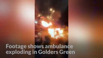 Dramatic footage shows an ambulance explode into a fireball moments after an elderly patient is dropped off at home.