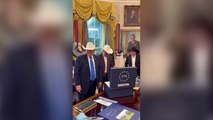 Trump indossa un cappello da cowboy: all'interno è scritta la Costituzione degli Stati Uniti