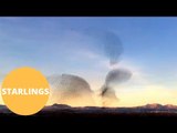 Thousands of starling caught swarming over sunset