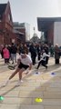 The 30th annual Shopmobility pancake race sees pancakes flying and teams racing across Woking town centre.