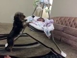 Dog rocks baby in cradle