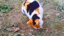Colorful cute cat eating food. This cat is very beautiful.