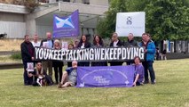 Demonstrators protest outside the Scottish Parliament over proposed government cuts <br />The protest was called to pressure the government to honor its promise of increasing culture funding by £100 million, ahead of key budget decisions in October. <br />
