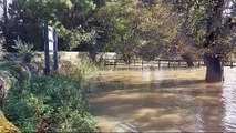 Flooding has affected Broughton Castle, near Banbury, where the moat is full to the brim and the sluice gates have been opened to avoid flooding of the house. This shows the water raging from the car park, past the Church to the moat