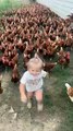Little Girl Chases Chickens to Play With Them