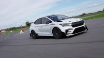 To reduce the weight compared to the production model, Škoda Motorsport engineers employed innovative and sustainable materials, removing all components not needed for the car’s intended use. Additionally, they incorporated side and rear windows made of lightweight polycarbonate. These measures together resulted in total weight savings of 316 kg. The sustainable biocomposite parts, developed in collaboration with Škoda’s motorsport partner Bcomp, are used in the bodywork, including the bumpers, fenders, roof, roof vent, and rear wing. These lightweight materials are also applied in the interior, such as the dashboard, door panels, and footrests for the driver and passenger. Additionally, the standard model’s panoramic glass roof was replaced with a biocomposite panel.