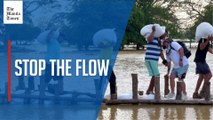 People affected by flooding in Colombia build improvised barriers