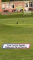 This man was playing golf. He hit his ball and then the coyote laying near a hole, ran and stole his ball. It then ran away with the ball in it's mouth.