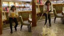 This video captures a comical incident that could've easily been avoided if people had eyes on the sides of their heads. <br /><br />The clip features Alicia doing a little dance as she walks toward her friends at the beach, completely unaware of the man beside her carrying a tray full of drinks. <br /><br />Alicia extends her hand sideways, inadvertently knocking over the glasses on the tray and spilling the drinks. <br /><br />While Alicia is totally baffled by the mishap, the man is engulfed in disappointment.<br /><br />Location: Malaga, Spain <br />WooGlobe Ref : WGA746532<br />For licensing and to use this video, please email licensing@wooglobe.com