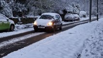 Traffic, walkers and joggers moving slowly in the snow in High Storrs, Sheffield