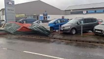 Sheet roofing flies from Minehead building to land on parked cars during Storm Bert