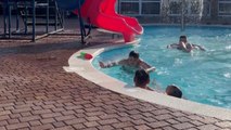 Little girl's pool slide ends with her unexpectedly landing on dad
