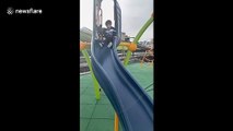 Who will win? Dog and boy compete in epic slide race in California