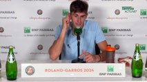 Le Français Arthur Fils après sa victoire contre le Brésilien Thiago Seyboth Wild. Dans la foulée de la victoire d'Ugo Humbert contre Joao Fonseca lors du tour qualificatif de Coupe Davis contre le Brésil, Arthur Fils, remis de sa blessure au pied et à la cheville, devait contenir Thiago Seyboth Wild. Comme son compatriote quelques minutes plus tôt, l'Essonnien a bien mené sa barque pour s'imposer en 1h08, 6-1, 6-4. La France mène donc 2 à 0 à la fin de la première journée et se rapproche de la qualif'. Mais la fin de match a été tendue entre les deux hommes... <br /><br />« Le tennis, partout & toujours ici », sur <br />https://www.tennisactu.net / Tennis Actu