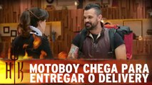 Motoboy chega para receber os pedidos no delivery