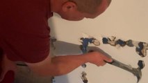 This couple had recently adopted Tater, the orange cat who was stuck behind the wall. Tater was still adjusting to his new surroundings and would frequently hide in different parts of the house. He saw the gap between this wall and the roof and jumped through. However, he was unable to climb back up. This guy then started cutting a hole in the wall to get Tater out safely.