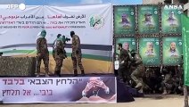 Hamas fa sfilare i tre ostaggi sul palco prima del rilascio