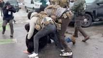 Agente della Border Patrol spruzza spray al peperoncino sul volto di un manifestante immobilizzato