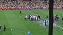 Leeds players celebrate promotion on the pitch at Elland Road