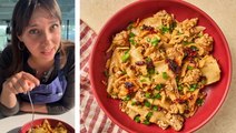 A pork dumpling-inspired filling—ground pork, shrimp, cabbage, scallions, and sauce—is served over chewy wheat noodles in this deconstructed bowl.