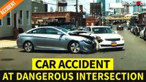 This car was taking a turn when the driver failed to notice the police car parked on the side of the road. As the car turned, it narrowly missed colliding with the officer exiting the vehicle but ended up hitting the cop car's door before coming to a halt.<br /><br />The underlying music rights are not available for license. For use of the video with the track(s) contained therein, please contact the music publisher(s) or relevant rightsholder(s).