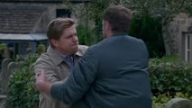 As Aaron and John are about to begin their vows, the ceremony is interrupted as Robert walks in. Aaron and the wedding guests look on stunned as Robert declares he's arrived to stop Aaron making the biggest mistake of his life. Aaron walks over and thumps him. Aaron's family force Robert to leave. Aaron finds Robert at the footbridge. Robert reveals he saw the news of his wedding posted on his family's social media and tells Aaron that he never stopped loving him. Robert informs Aaron that he had his sentence reduced after appealing the decision based on Luke's fight with Lee on the day of his death being a contributing factor in his death. He reveals he is on probation and is supposed to be at his first meeting now but he had to come back when he found out about the wedding. Aaron tells him he's moved on. Aaron confronts Robert about cutting him off when he went to prison. Robert admits he now regrets that decision. Chas finds them both on the footbridge, having just witnessed their kiss. She gets Robert to leave. John and Victoria find Robert at Jack's grave. Robert accuses John of stealing his life and warns him he should be worried. Aaron and Chas find John and Victoria just in time for John to tackle Robert to the ground during an argument. Aaron rushes in to separate them. Aaron tries to stop Robert from telling John about their kiss. Robert stops himself from revealing his kiss with Aaron to John. John asks Aaron to make a choice between him and Robert. <br />Aaron chooses John and heads back to the wedding.