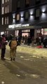 Fireworks are thrown during a standoff between anti-ICE demonstrators and LAPD Officers in Los Angeles, California.<br />