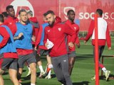 <p>El vicepresidente de la entidad acudió a presenciar la sesión de este lunes y saludó a cada componente del cuerpo técnico.</p><br>