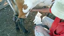 Cat drinks milk straight from cow's udder