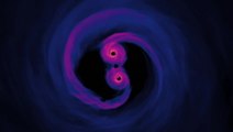 Supermassive black holes spiral towards each other in this simulation created by NASA's Goddard Space Flight Center that shows how they glow in ultraviolet and X-ray light. The black holes are only 40 orbits from merging. <br /><br />Credit: NASA Goddard Space Flight Center