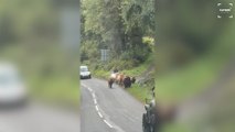 HIGHLAND COWS NEARLY COLLIDES WITH VAN ON EMPTY ROAD<br />WITH VID<br />By Jaiansh Sharma<br />A holiday drive through the Isle of Mull turned into an unforgettable encounter when a pack of Highland cows took over the road, forcing a campervan to stop.<br />The video, filmed by Carrie Brookes, from Whitley Bay, UK, shows the herd calmly strolling past the vehicle one by one, their massive horns filling the frame.<br />But the last cow brings a surprise twist, bouncing and jumping around before nearly colliding with the van.<br />Carrie and her husband Paul, who were inside the campervan, could only laugh and wait as the shaggy giants passed by.<br />The clip was posted on Instagram and one user commented: “Toto, I’ve a feeling we’re not in Whitley Bay any more.”<br />Another added: “I lived on Skye for 10 years a long time ago,this brings back memories.”<br />ENDS