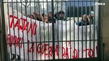 Scontri e cariche delle forze dell’ordine davanti al Museo Egizio di Torino, tra fumogeni e lancio di bottiglie verso polizia e carabinieri. Una manifestante è stata bloccata dalle forze dell’ordine. Un bersaglio, come quelli per le freccette, con sopra le facce di Meloni, Tajani, Netanyau, Trump, Salvini, è uno dei cartelli nella manifestazione pro Pal. Poco dopo gli sconti con le forze dell’ordine, una ragazza, chinandosi, ha tirato una freccia, centrando proprio l’immagine del Presidente del Consiglio, dicendo: «Centrata». Sotto il bersaglio la scritta: «Gioca responsabilmente (fino a un certo punto)».