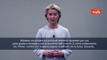 Johannesburg, 23 nov. (askanews) - "L'Ucraina è stata al centro di numerose discussioni negli ultimi giorni. Qualsiasi piano di pace credibile e sostenibile dovrebbe innanzitutto porre fine alle uccisioni e alla guerra, senza però gettare i semi di un futuro conflitto". Lo afferma la presidente della Commissione Ue Ursula von der Leyen in un videomessaggio postato sui social."Abbiamo concordato sui principali elementi necessari per una pace giusta e duratura e per la sovranità dell'Ucraina - prosegue Von der Leyen -. E vorrei evidenziarne tre. Primo, i confini non possono essere modificati con la forza. Secondo, in quanto nazione sovrana, non possono esserci limitazioni alle forze armate ucraine che renderebbero il Paese vulnerabile a futuri attacchi, compromettendo così anche la sicurezza europea. Terzo, la centralità dell'Unione Europea e la garanzia della pace per l'Ucraina devono essere pienamente rispettate"."L'Ucraina deve avere la libertà e il diritto sovrano di scegliere il proprio destino. Ha scelto un destino europeo. Tutto inizia con la ricostruzione del Paese, la sua integrazione nel nostro mercato unico e nella nostra base industriale di difesa, e infine l'adesione all'Unione", sottolinea Ursula von der Leyen.
