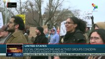 In Spain, protesters expressed their rejection of the U.S. attacks against Venezuela in front of the United States Embassy in Madrid. teleSUR<br />