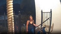 An elderly man stepped out of the house and fell down on the snowy surface. He managed to get back up but lost his footing and fell for a second time.