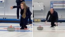 Princess Kate remains just about steady on the ice as she gives curling a go, on a visit alongside Prince William to the National Curling Academy in Scotland. Prince William gets further than Kate, but misses the target ahead of him. <br /> Report by Keechl. Like us on Facebook at http://www.facebook.com/itn and follow us on Twitter at http://twitter.com/itn