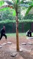 A realistic daylight strength challenge inside a gorilla enclosure. A professional martial artist attempts a powerful flying kick on a firmly planted banana tree, causing it to shake slightly but remain standing. Moments later, the gorilla steps in and strikes the same tree with natural force, breaking it completely and bringing it down. The scene focuses on real-world physics, authentic movement, natural reactions, and true-to-life strength differences — no cinematic effects, no slow motion, just raw realism captured in a documentary-style camera view.