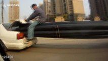 While visiting a drive-through safari, this person was recording their kids’ reaction to a llama poking its head through another window. Moments later, another llama walked up to the man’s window and suddenly stuck its head inside, startling him because he hadn’t noticed the animal right beside him.